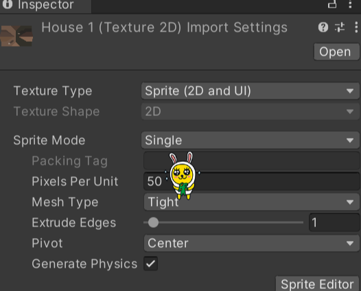 이걸 50으로 조정하면 이미지의 1 유니티 단위당 픽셀이 50이 된다